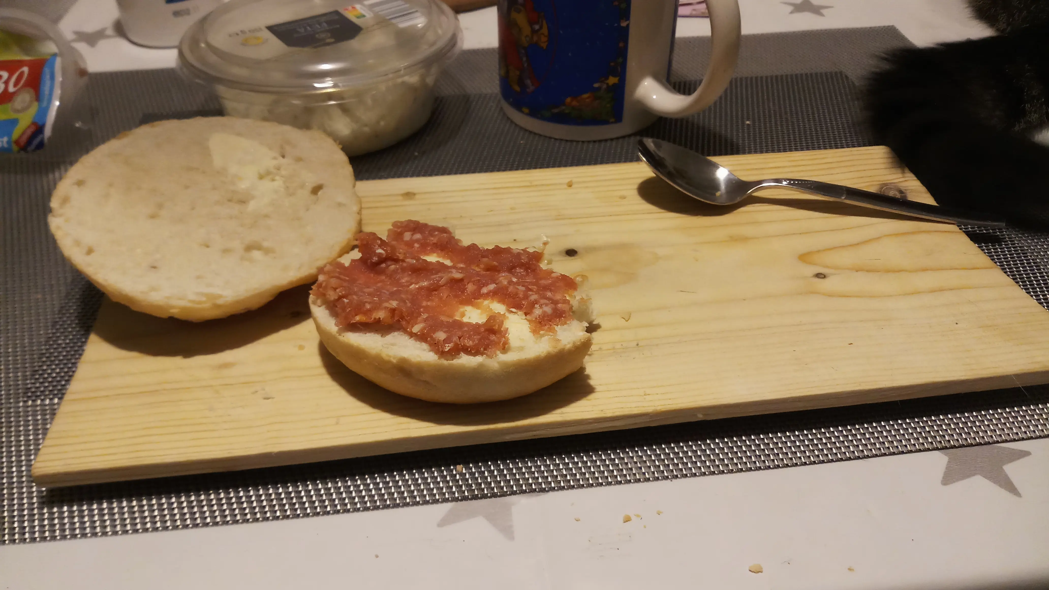 Ein Brötchen nehmen und bestreichen.